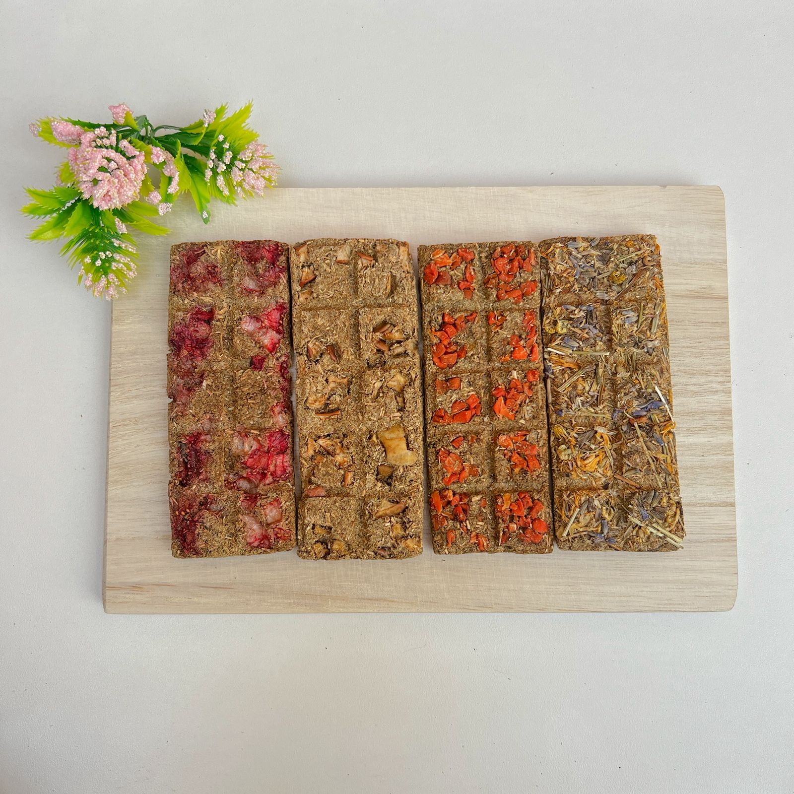 . Petiscos feitos de feno triturado e aromatizado com ervas naturais.