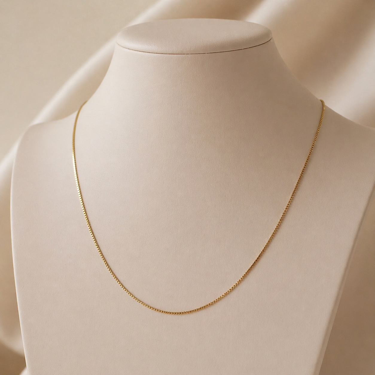 A corrente veneziana é um clássico indispensável em qualquer porta-joias. Conhecida por seus elos quadrados e bem ajustados, ela reflete a luz de forma contínua, proporcionando um brilho sofisticado e linear. É a escolha perfeita para destacar pingentes com leveza e segurança.
