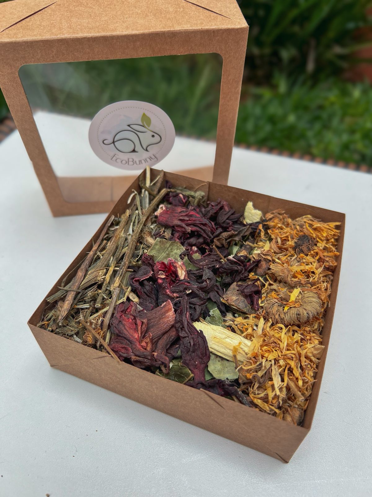Nosso Mix de Ervas EcoBunny é cuidadosamente selecionado para proporcionar bem-estar, diversão e benefícios nutricionais aos pequenos. Feito com ingredientes de alta qualidade, frescos e desidratados lentamente, ele traz variedade de texturas, aromas e sabores que estimulam o enriquecimento ambiental de forma segura e natural.