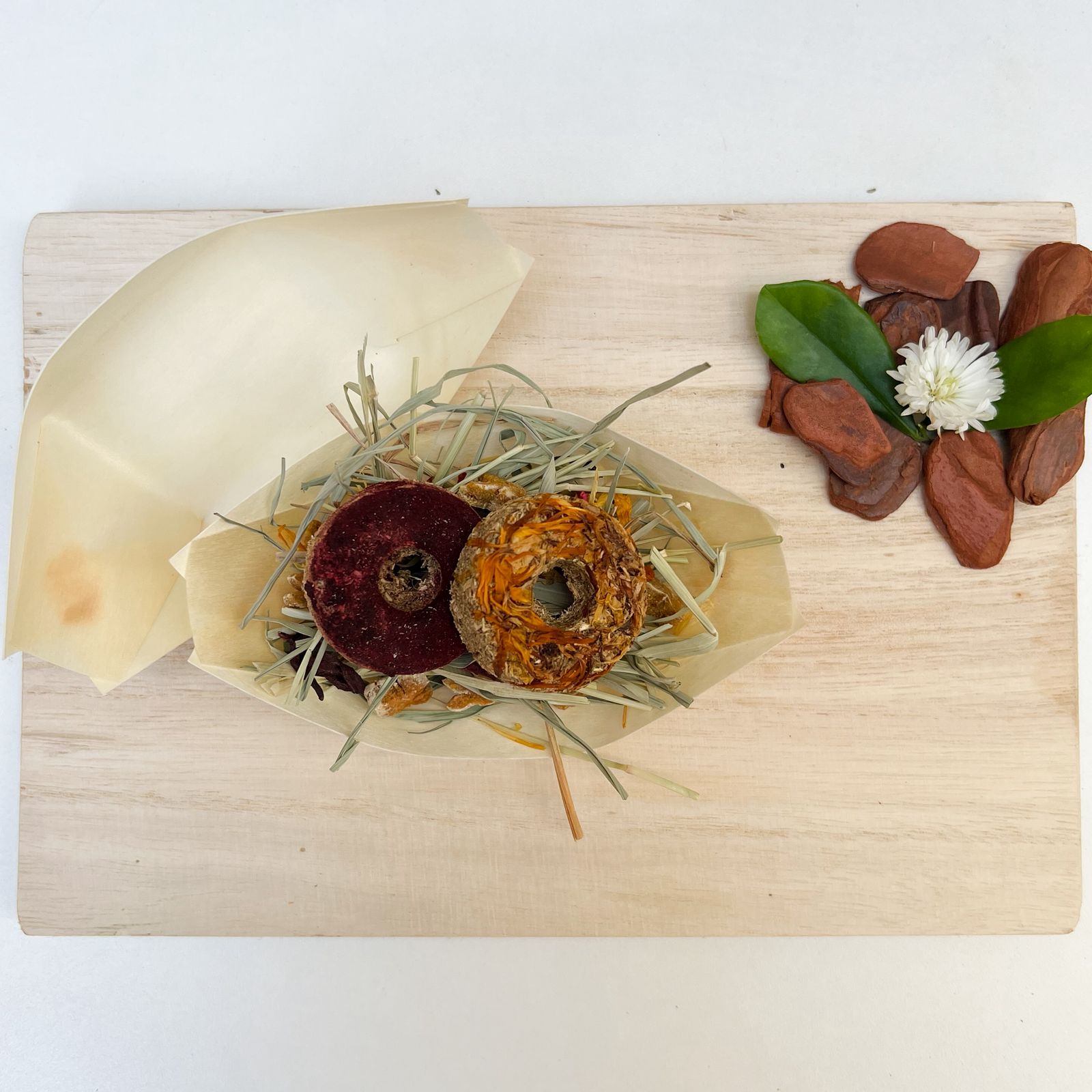 . Petiscos feitos de feno triturado e aromatizado com ervas naturais.
